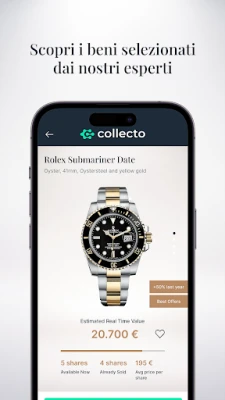 Con Collecto, il lusso è a portata di mano. Accedi a orologi esclusivi, arte unica e vini rari tramite la proprietà frazionata. Realizza il sogno di diventare co-proprietario di beni inestimabili.
