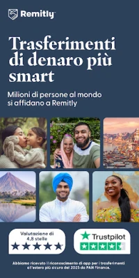 Remitly semplifica l'invio di denaro all'estero per famiglie e amici. Goditi un servizio finanziario transfrontaliero affidabile, con 470.000 punti di ritiro contanti o oltre 5 milioni di conti bancari e mobile wallet. Supporta varie valute e i destinatari non pagano commissioni.