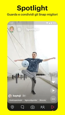Esplora un universo di narrazioni accattivanti attraverso le Storie, seguendo le giornate dei tuoi amici o immergendoti in contenuti della community curati in base ai tuoi interessi. Scopri le ultime notizie e Show esclusivi, offrendo intrattenimento e prospettive sempre nuove. Non perdere il meglio di Snapchat su Spotlight, la piattaforma dove i contenuti più coinvolgenti prendono vita: condividi i tuoi capolavori o lasciati ispirare da un flusso costante di creatività.